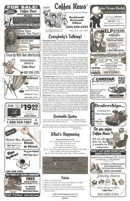 Effective 07/15/2014, we are very pleased to announce that Websnoogie, LLC will now be partnering with the Big O Coffee News of Omaha. The Big O Coffee News is distributed in dozens of restaurants and coffeehouses in the Omaha and Bellevue Nebraska area and is a nationwide publication serving millions of readers each week. The publication is designed for the readers enjoyment and to maximize the exposure of the advertiser. The Big O Coffee News provides news articles and interesting information to its readers, and has thousands of readers each week in the Omaha area. The Coffee News is distributed to over 240 locations in Omaha and Bellevue. Advertisers in the Coffee News have an opportunity to reach out to the readers by having their advertisement displayed at a very reasonable cost.